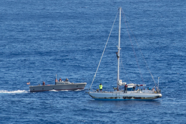 Operating near the area on a routine deployment, Ashland made best speed to the location of the vessel in the early morning on Oct. 25 and arrived on scene at 10:30 a.m that morning. After assessing the sailboat unseaworthy, Ashland crew members brought the distressed mariners and their two dogs aboard the ship at 1:18 p.m.