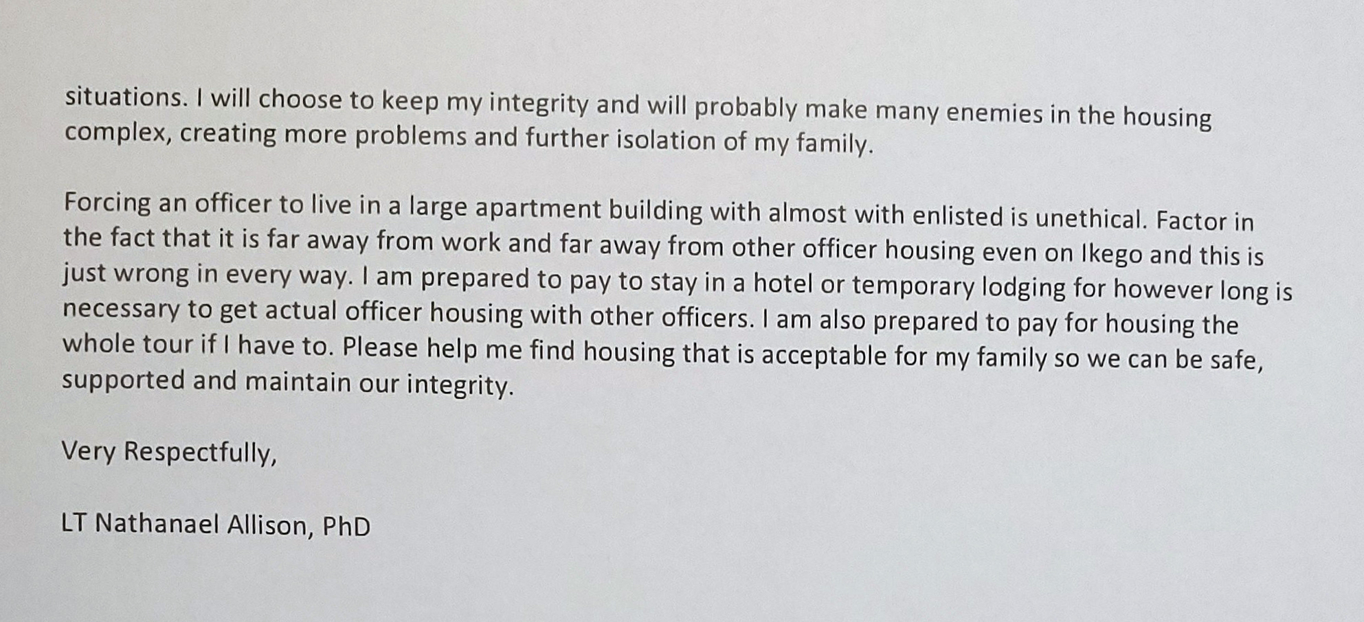 Task & Purpose obtained a copy of the letter that was signed by Lt. Nathanael Allison, PhD, who wrote that he had received orders to live in Yokosuka, Japan, for the next three years and he was willing to pay for his family to live in hotels rather than being billeted in enlisted housing.