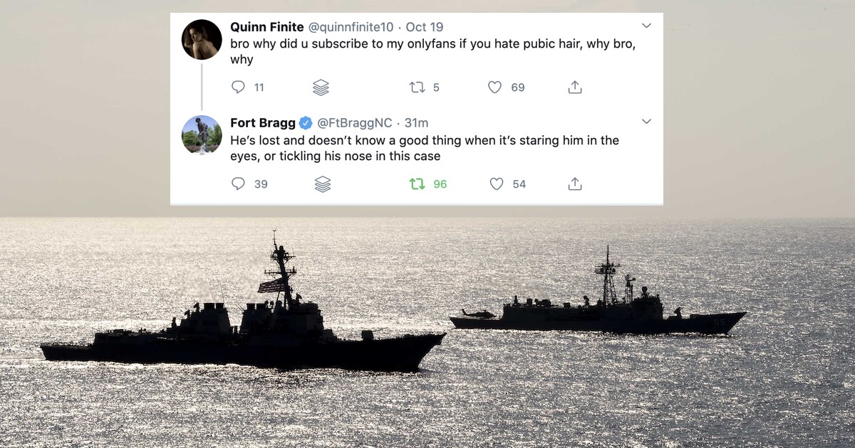 Here’s to you, U.S. Navy, for keeping your Twitter feed both humor-ready and horny-free. Maybe Fort Bragg could learn a thing or two from you.