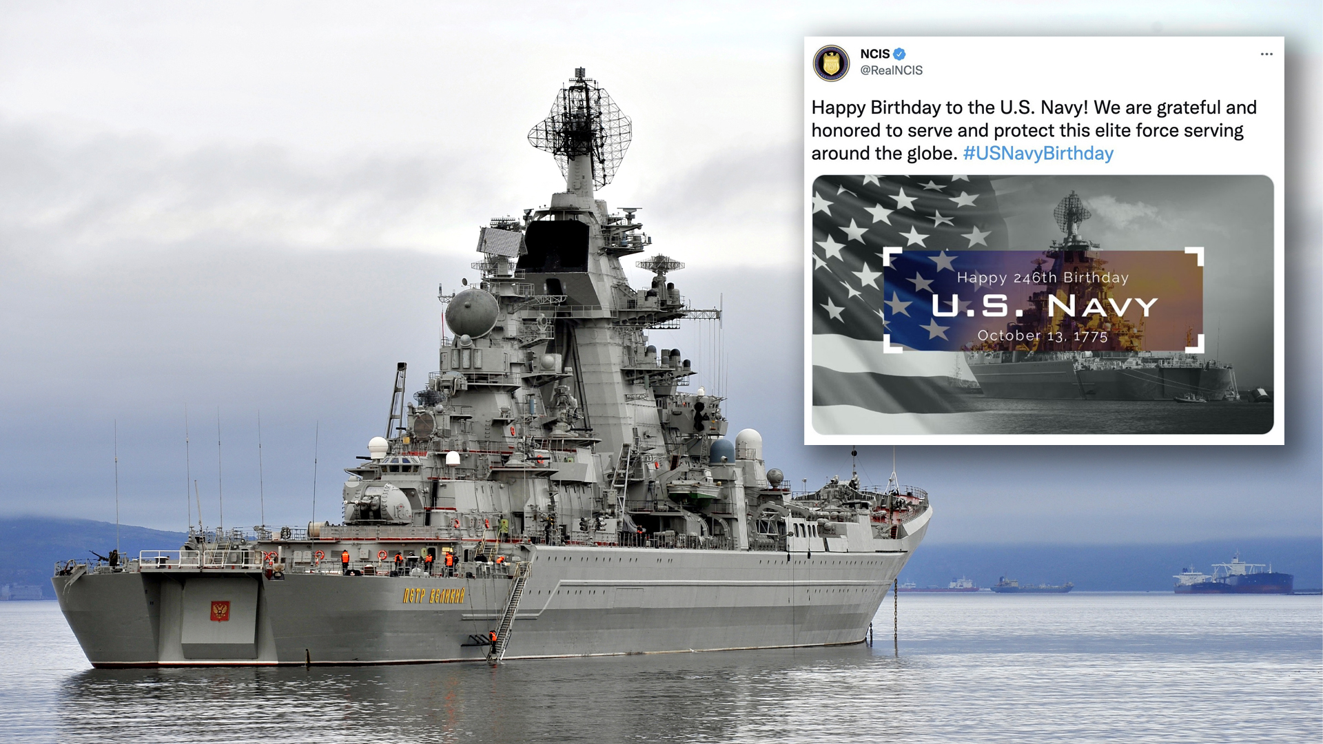 The tweet, which has since been deleted, raised some eyebrows online because while it did wish the Navy a happy 246th Birthday, it did so with a photo composite showing an American flag alongside a Russian Kirov-class battlecruiser.