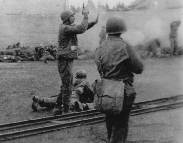 Alex Kershaw: I came across an image on Google of Dachau and it showed Felix Sparks. It’s a Signal Corps’ cameraman’s image of him firing his pistol into the air. It’s in the Dachau coal yard on the 29th of April, 1945. It shows him, literally, it shows him firing his colt and thrusting his hand out in the air.