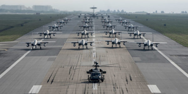Fully armed aircraft from the 18th Wing conduct an elephant walk during a no-notice exercise April 12, 2017, at Kadena Air Base, Japan. The 18th Wing operates combat ready fleets of HH-60 Pave Hawks, F-15 Eagles, E-3 Sentries and KC-135 Stratotankers, making it the largest combat-ready wing in the U.S. Air Force. Kadena AB provides leading-edge counter air, command and control, air refueling and combat search and rescue operations, enabling theater commanders of joint and allied partners to project and enhance lethal, persistent and flexible combat power in response to adversaries.Photo via DoD