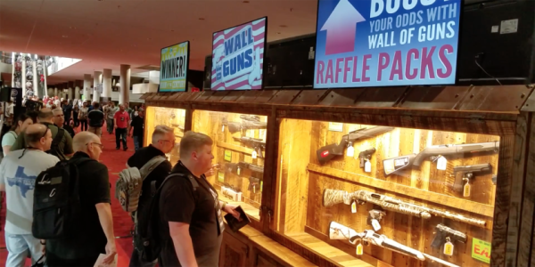“Alright folks, the WALLLLLLLLLL OF GUUUUUUUNS goin’ on right now. 2017 NRA Annual Meeting here in beautiful Atlanta, Georgia. BOOM shock-a-locka! Get your chance right now. Folks I got a deal goin’ on, we got about twenty chances, here’s the deal: Gimme a hundred dollars, gonna give you five chances on the WALLLLLL OF GUUUUUUNS.”