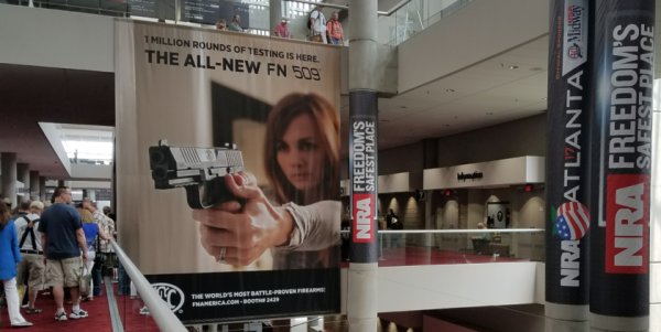 The first thought I have, passing through the main entrance of the Georgia World Convention Center for the National Rifle Association’s annual meeting in Atlanta, is that I must be crazy, because I’m hearing voices. Well, a voice — a drawled, gravy-dipped bass that sounds distinctly like an enticement… or a threat.