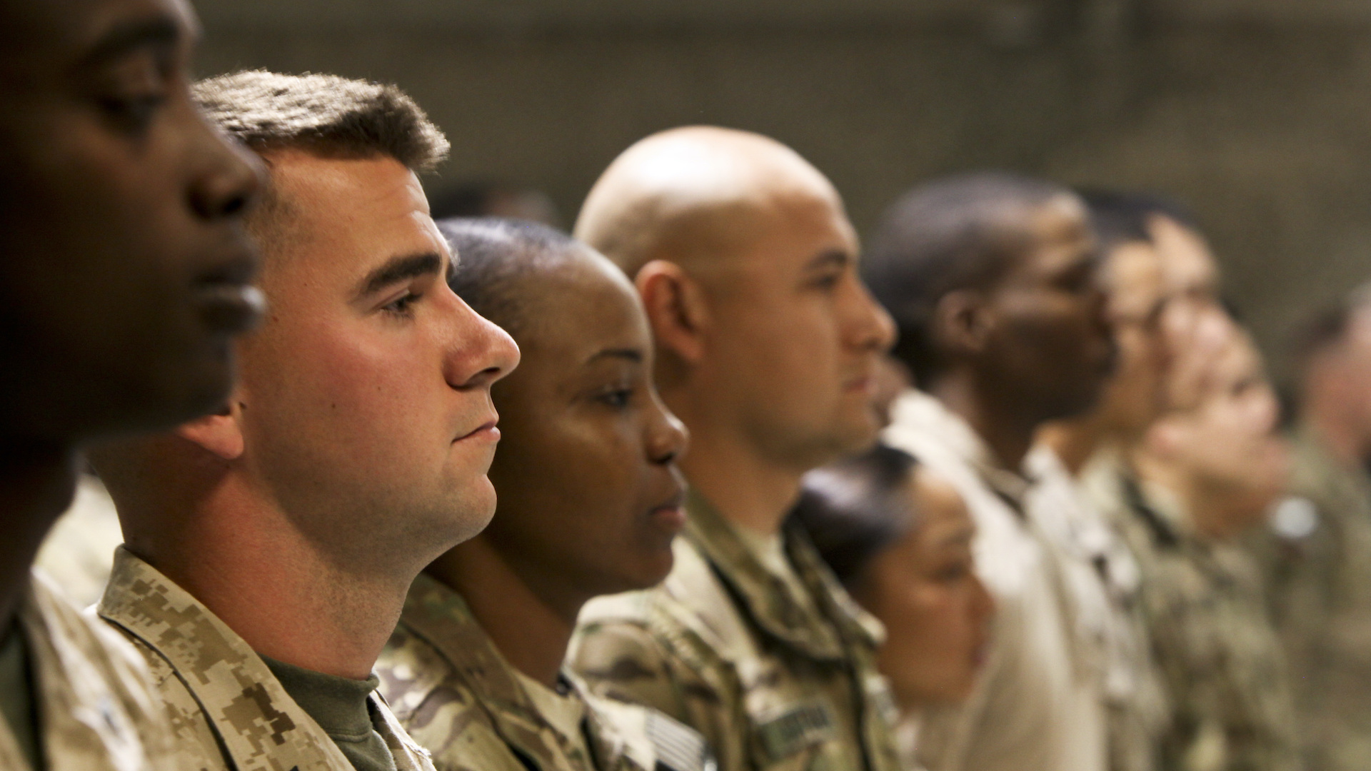 Featured image: Troops stand for the national anthem during a naturalization ceremony at Kandahar Airfield, Afghanistan, March 1, 2013. (Photo by Sgt. Bobby J. Yarbrough)