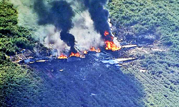The wreckage of a KC-130 that crashed while ferrying Marine Corps personnel and equipment from Marine Corps Air Station Cherry Point in North Carolina to Naval Air Facility El Centro in California on July 10, 2017Screenshot WLBT News