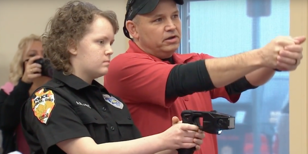 Elkins took aim at her first target, Sgt. Doug Bline, who acknowledged that, yes, getting momentarily paralyzed by a powerful electric jolt is painful, but, in this case, totally worth it. The crowd gathered for the occasion shouted “Taser! Taser! Taser!” Elkins pulled the trigger and Bline crumpled to the floor. Then her next target stepped onto the mat. It was her uncle.