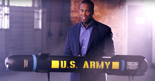 “Hunting terrorists in the skies above Baghdad, there are two things you need: Faith in God,” James says, then cracking a smile. “And a Hellfire missile.” This all of course as the ad features gun camera footage from Iraq.