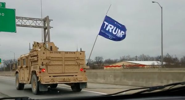 On Jan. 29, as a woman was idly filming a convoy of military vehicles driving down a Louisville, Kentucky highway, one had an unexpected flag. As the lead vehicle passed, the woman was caught off-guard by a blue flag emblazoned with Trump’s name flying off the back of the rig.