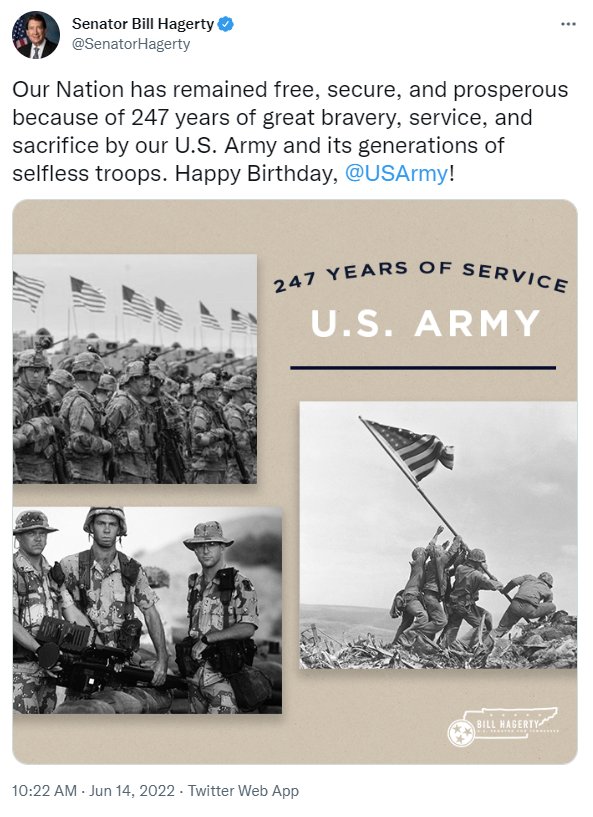 Sen. Bill Hagerty (R-Tenn.) got in on the well-wishing action this morning with a birthday message that included a photo of one of the branch’s most iconic moments — raising the flag at Iwo Jima. Err. Wait a minute…