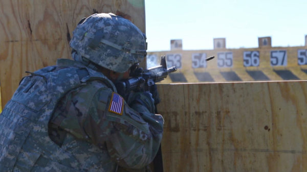 Sgt. 1st Class Julio Castellanos, an operations sergeant assigned to the 815th Brigade Engineer Battalion, 1st Security Force Assistance Brigade, fires an M4 carbine during a stress shoot Oct. 20, 2017, at McAndrews Range on Fort Benning, Ga.