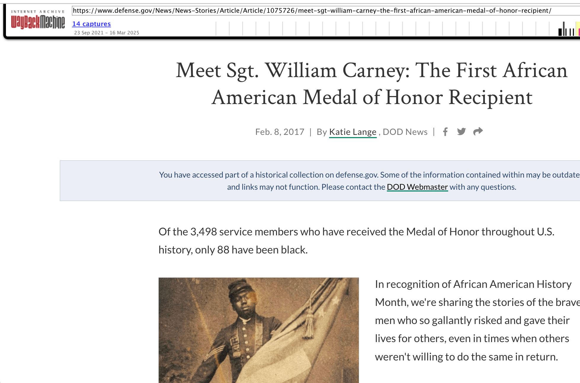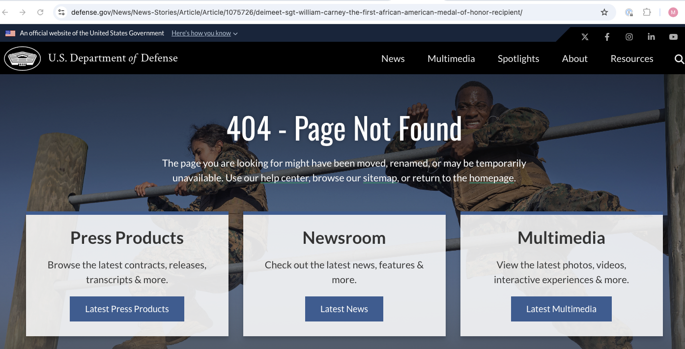 But as of Wednesday morning, the 2017 article “Meet Sgt. William Carney: The first African-American Medal of Honor recipient” (archived version) has been removed from the Pentagon’s Defense.gov domain, which is the primary public information website of the Department of Defense. The page now reverts to a 404 error — an internet term for a missing page — and the URL address for the page now has “DEI” added to its title.
