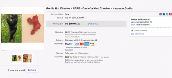 Now, nearly a year after his tragic death, Harambe has surfaced once again, this time as a Flamin’ Hot Cheeto for auction on eBay. The listing showed a picture of the Cheeto, which at first glance looks like nothing more than a red-hot baked lump of cornmeal. But then, when placed alongside a picture of a gorilla climbing a tree, as it was in the eBay listing, it becomes instantly obvious what it actually is: a Flamin’ Hot Harambe.