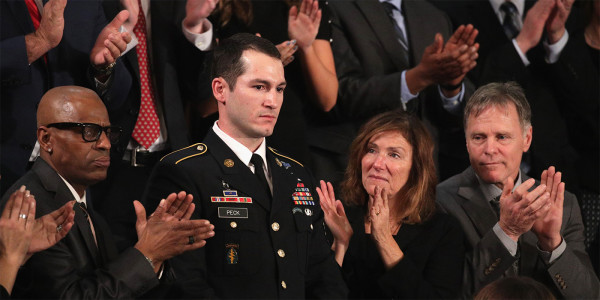 Trump extolled the sacrifice of Staff Sgt. Justin Peck, who “bounded into” a booby-trapped building to rescue his severely wounded comrade. “He applied pressure to the wound and inserted a tube to reopen an airway,” Trump said. “He then performed CPR for 20 straight minutes during the ground transport and maintained artificial respiration through two hours of emergency surgery.”