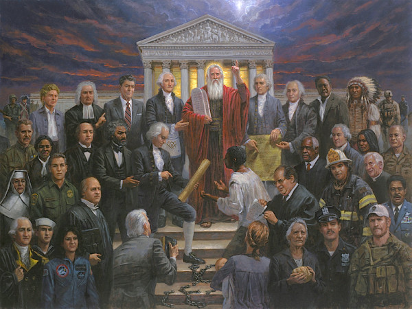 A father of eight, who makes his home outside of Provo, Utah, McNaughton had come to Baton Rouge — a two-day van ride with his 23-year-old son, Nathan — to unveil his latest work. Titled “Justice for All,” the painting features Moses standing on the steps of the U.S. Supreme Court building, surrounded by a collection of historical and contemporary figures, from George Washington to Condoleezza Rice and Chris Kyle. In the foreground, a black slave kneels before James Madison, begging for his freedom, a tangle of broken shackles at his feet. Behind him, a peeved-looking Antonin Scalia rips some misbegotten legal decision in two.