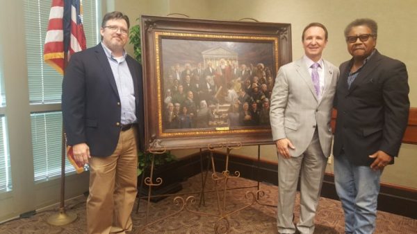 McNaughton poses in front of his new painting with Louisiana Attorney General Jeff Landry and radio host Rev. C.L. Bryant.Photo by Aaron Gell