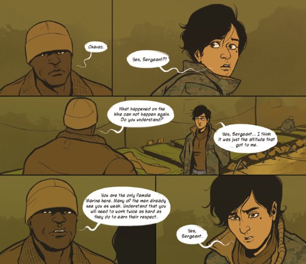 Yeah, exactly. I wanted to have a female character in there, but not draw too much attention to it, because of the fact that this is not her story. And I think that there is a really great story where the central protagonist is a female infantry Marine in a platoon, maybe a story for another time.