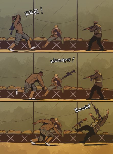 I wanted to have a female character, and I wanted to play with sexuality in that environment, like maybe she’s not straight, which she’s not in the story, and yeah, it was sort of my own thought experiment to see how the dynamics with a female infantryman could work and function in a platoon of male Marines and have it have nothing to do with romance, and not think about any of that nonsense that people bring up, as it relates to that whole subject.