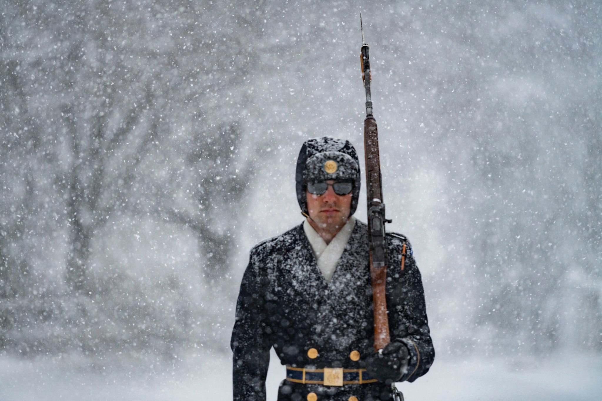 Photographs showed the guard detail of the 3rd U.S. Infantry Regiment, known as the Old Guard, marching amid the heavy snowfall in front of the Tomb, the final resting place for unknown service members killed during World War I, World War II, and the conflicts in Korea and Vietnam.