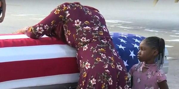 On the tarmac, Johnson was met by his widow, Myeshia. Pregnant with the couple’s third child and with their eldest in tow, Myeshia did what too many military spouses have done since the dawn of the Global War on Terror: She bent over her late husband’s casket and wept.