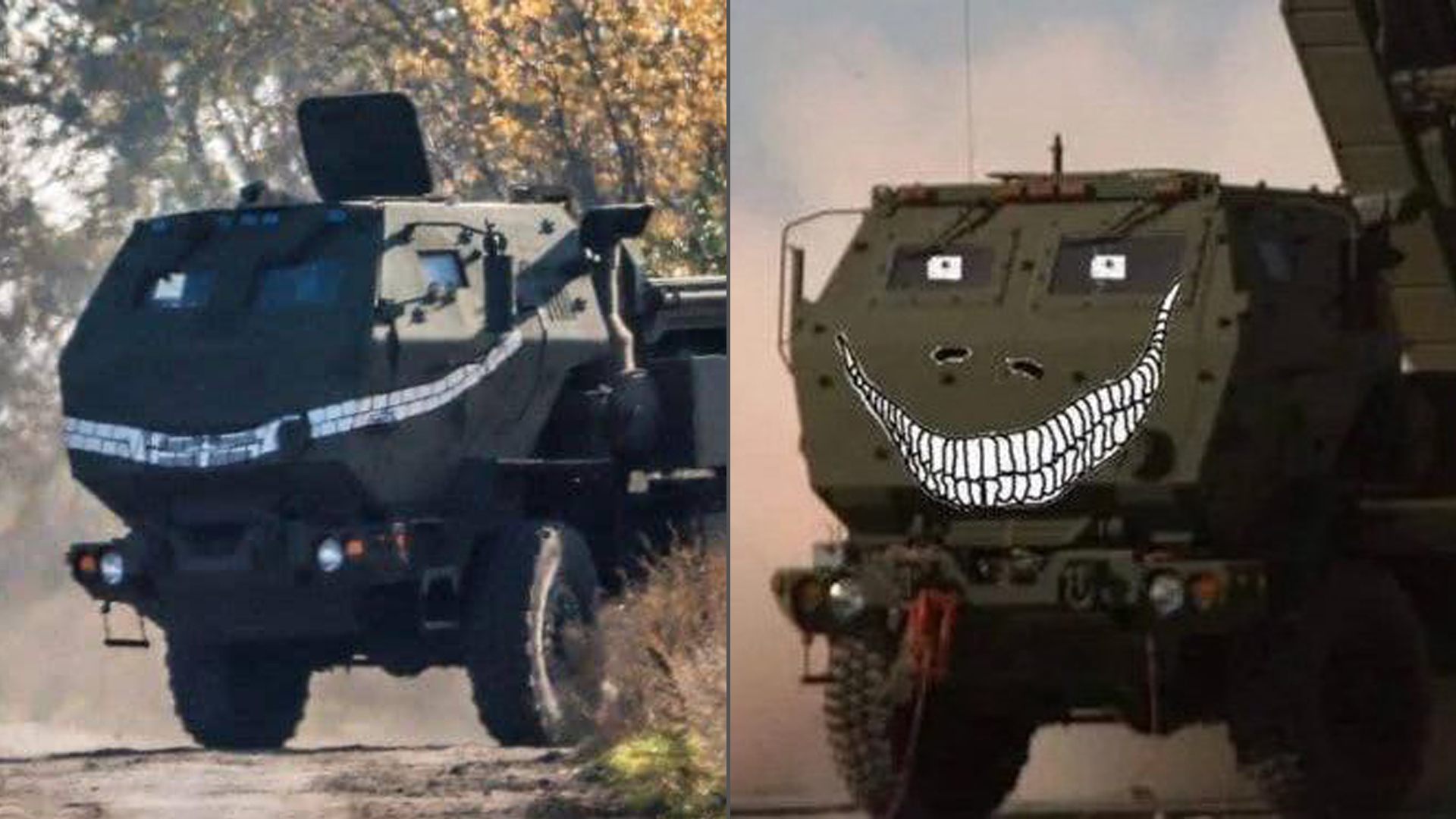 Here, yet again, is an example of the fifth domain of warfare — cyberspace — leaking into its more terrestrial equivalent. Another Ukrainian vehicle painted to resemble an internet meme. In this case, it’s a picture of a M142 High Mobility Artillery Rocket System, or HIMARS, painted with a toothy grin.