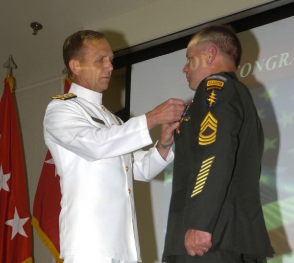 Master Sgt. Brendan O’Connor, right, 7th Special Forces Group (A) Operational Detachment Alpha, was awarded the Distinguished Service Cross by Adm. Eric T. Olson, commander of United States Special Operations Command, during a ceremony at Bank Hall, Fort Bragg, N.C., April 30, 2008.Photo by Sgt. Daniel Love