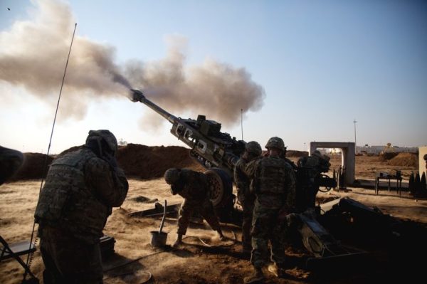Soldiers with Battery C, 2nd Battalion, 319th Airborne Field Artillery Regiment, 82nd Airborne Division fire their M777 towed 155 mm howitzer during a fire mission near Mosul, Iraq, Feb. 03, 2017.U.S. Army / Spc. Craig Jensen.
