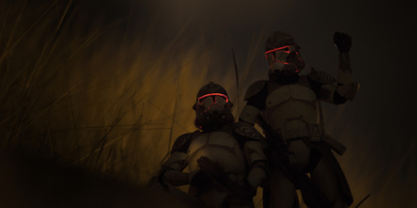 A Clone Commander drags a wounded clone out of a kill zone after being ambushed by separatist forces.