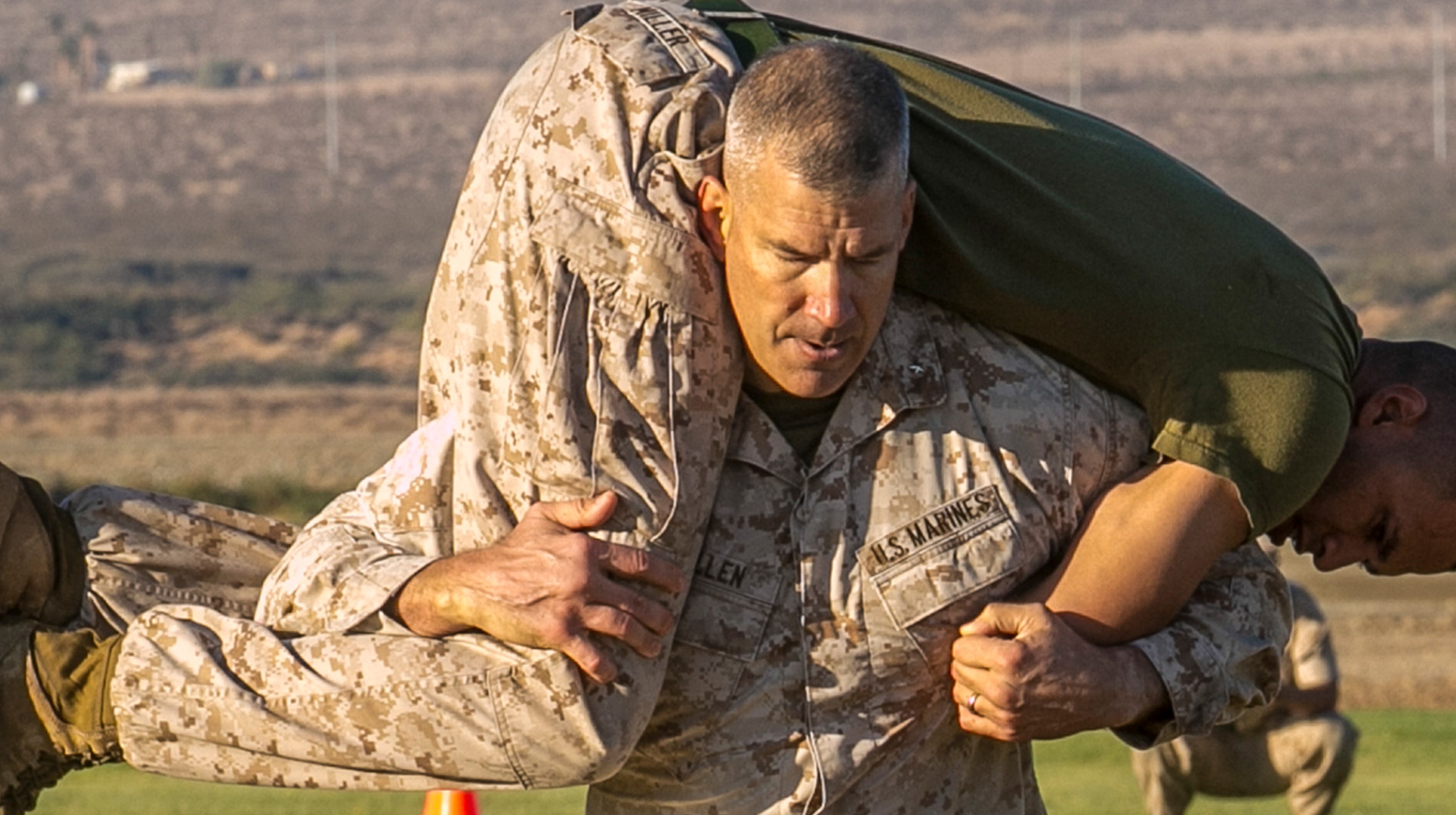 In 2016, a Twentynine Palms photographer photographed then-brigadier general Mullen taking the Marine Combat Fitness test, including as the over-50 Marine carried a much-younger partner in a fireman’s carry.