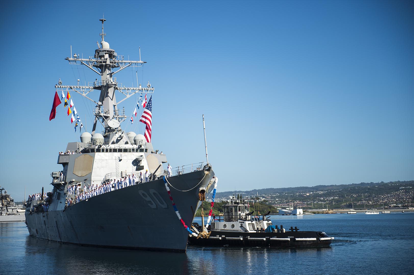The destroyer USS Chafee returns to Joint Base Pearl Harbor-Hickam from an independent deployment to the Western Pacific and South America, Jan. 12, 2018. (U.S. Navy photo by Mass Communication Specialist 2nd Class Justin R. Pacheco.)