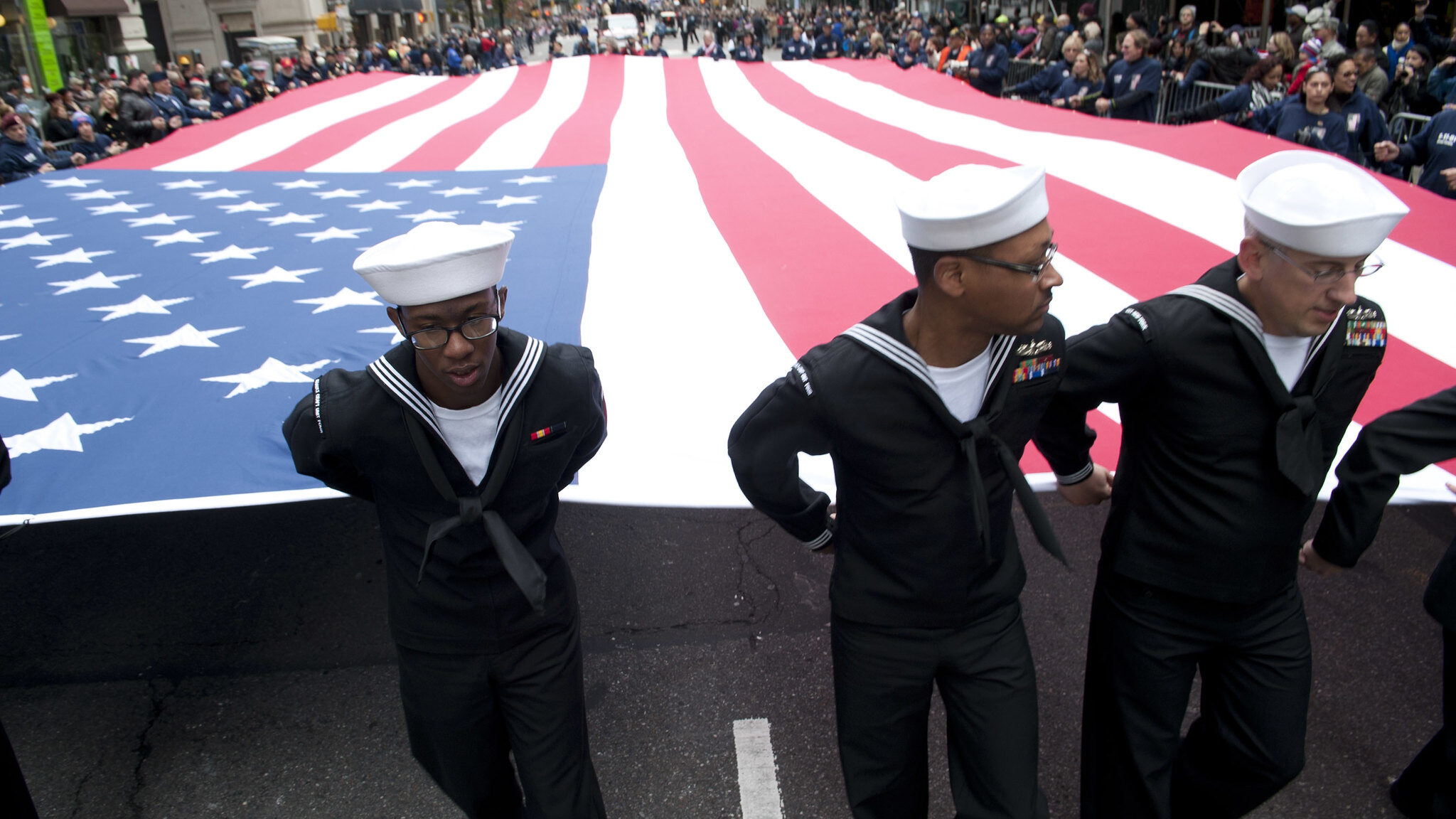 Sailors hold the national ensign as they march during the NYC Veterans Day Parade. (U.S. Navy photo by Mass Communication Specialist 1st Class Martin L. Carey) Sailors hold the national ensign as they march during the NYC Veterans Day Parade. (Mass Communication Specialist 1st Class Martin L. Carey/U.S. Navy)
