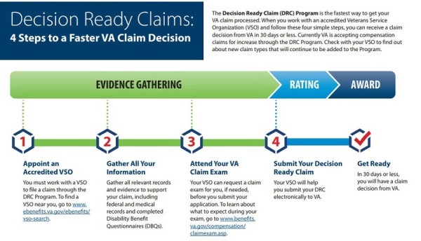Currently, veterans can submit a claim with little additional paperwork, which places the impetus on the VA to collect the required documents, schedule any necessary exams, and generally, do most of the heavy lifting. Under the Decision Ready Claims process, veterans can opt to do that legwork themselves ahead of time.