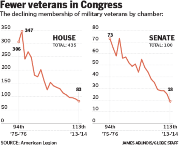 Today, with our nation recovering from two long wars fought by an all-volunteer force, the number of veterans in the House has shrunk substantially — to less than 100.