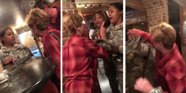 A 71-year-old white woman has been arrested for assaulting two uniformed Army Reserve captains — one of them pregnant — in a Macon, Ga., Cheddars after she and her large son taunted the officers as “black lesbian bitches” over a parking-space dispute — an incident that one disturbed restaurant patron captured in a now-viral video.