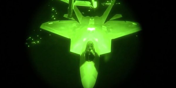 A video recently uploaded to YouTube includes rare footage of U.S. F-22 Raptors refueling during an anti-ISIS operation over the Middle East.According to the Aviationist, the footage was captured from a KC-10 Extender tanker assigned to the 908th Expeditionary Air Refueling Squadron. The Aviationist also reports that the video, part of which was filmed through a night vision device, shows the most up-to-date Raptors in action. But what makes the video exceptionally cool, in my opinion, is the clear view of the cockpits it offers. The American flag draped inside the second jet is a nice touch.