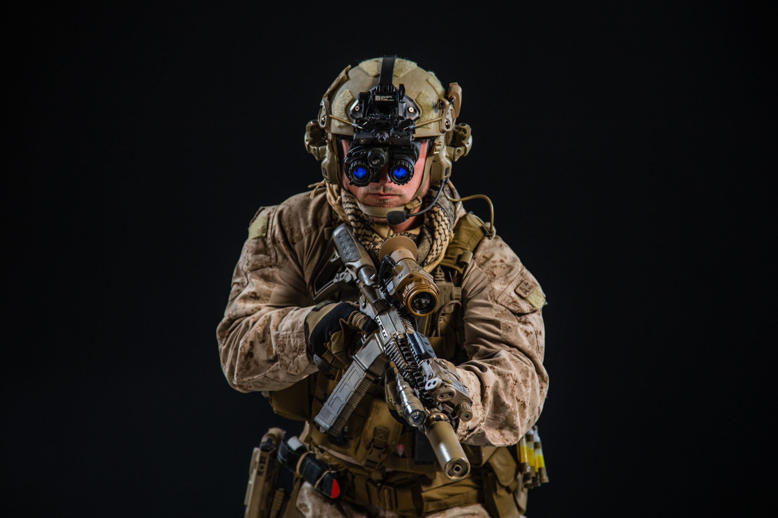 Feature image: A photo composite showing the view through the ENVG-Bs and a photo of what that piece of gear (and all the other high-tech equipment) look likes when it’s all strapped to your kit.