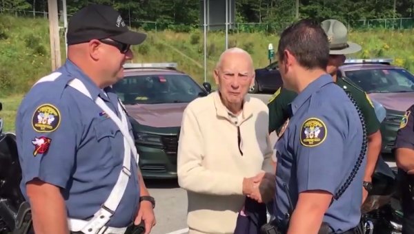 A routine traffic stop and speeding ticket in June became the catalyst for a patriotic display on Aug. 6, when police officers escorted 96-year-old Marine Corps vet Harold Sheffield from Bristol, New Hampshire, to the state line in a “rolling salute.”