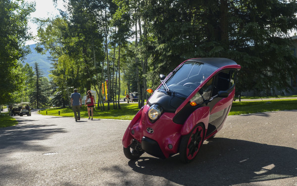 Climbing into the driver’s seat feels a bit like getting into a cockpit. It’s a strange feeling to have windows directly to the front, left, and right. With the release of an emergency brake, the start of an engine, and the push of a button, I was off in my pink i-Road, weaving through a course of cones at Aspen High School.