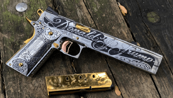 And, well, he nailed it. Beyond all the gold and shiny, the pistol says “Donald Trump” on one side, “45th President of the United States Of America” on the other, and “Build That Wall” on the muzzle. It has a two-piece slide and compensator, and also comes in a handmade case apparently created from one of the George Washington’s original Chestnut trees.